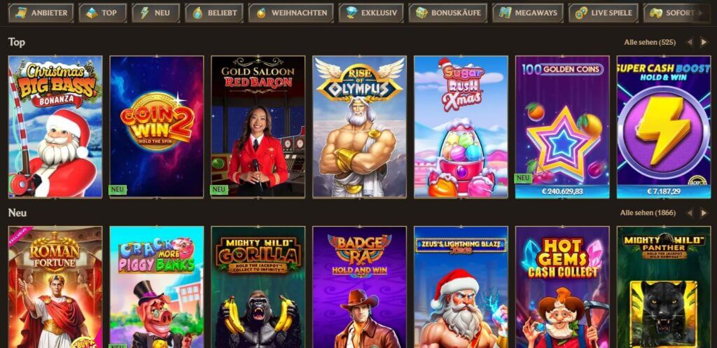 Bei diesem Casino haben Sie im Bereich der Slots die Qual der Wahl. Zu den beliebtesten Titeln gehören unter anderem Rise of Olympus und Le King. Neue Slots sind mitunter Badge of Ra Hold & Win und Carnival Rush Bonus Mania. Klassiker wie Ramses Book stehen Ihnen ebenfalls zur Auswahl.
